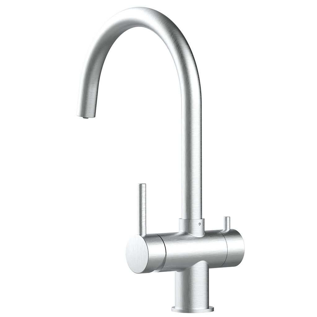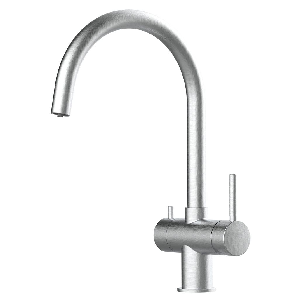 Die hochwertige Design Armatur Furore aus Edelstahl ist nicht nur optisch ein Highlight, sondern sie überzeugt auch durch ihre Funktionalität. Sie besitzt eine separate Wasserführung im Inneren, für eine klare Trennung von Filter- und Brauchwasser in nur einer Armatur.
